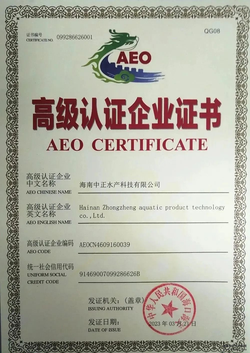 【企業(yè)榮譽(yù)】中正水產(chǎn)獲批成為海南首家水產(chǎn)種業(yè)進(jìn)出口AEO高級認(rèn)